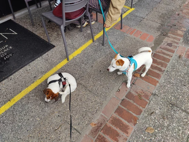 V Larisse už jsem jednu kavárnu měl osrdíčkovanou. Tam ale bylo moře lidí a nám se tam nechtělo. Tak jsme se stavili v jiné, Ron.Coffee, kde jsme potkali dva pejsky. Jacka jménem Ares a křížence labradora s pitbullem jménem Odin <3